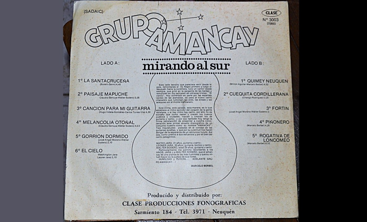 Raimundo Negrete colecciona vinilos y entre los miles que guarda en su casa, en Neuquén, atesora uno que habla de la historia cultural en Cinco Saltos. “Mirando al Sur”, dice su portada y el nombre del grupo, “Amancay”, aparece acompañado por las estrellas que forman la cruz emblemática, marcando ese punto cardinal. De pie con sus instrumentos, de impecables atuendos celestes y ostentando las guardas de sus ponchos, se puede ver a Mateo y Leoner Jara, junto a Walter Sodero, de apenas 21, 20 y 29 años, respectivamente.
