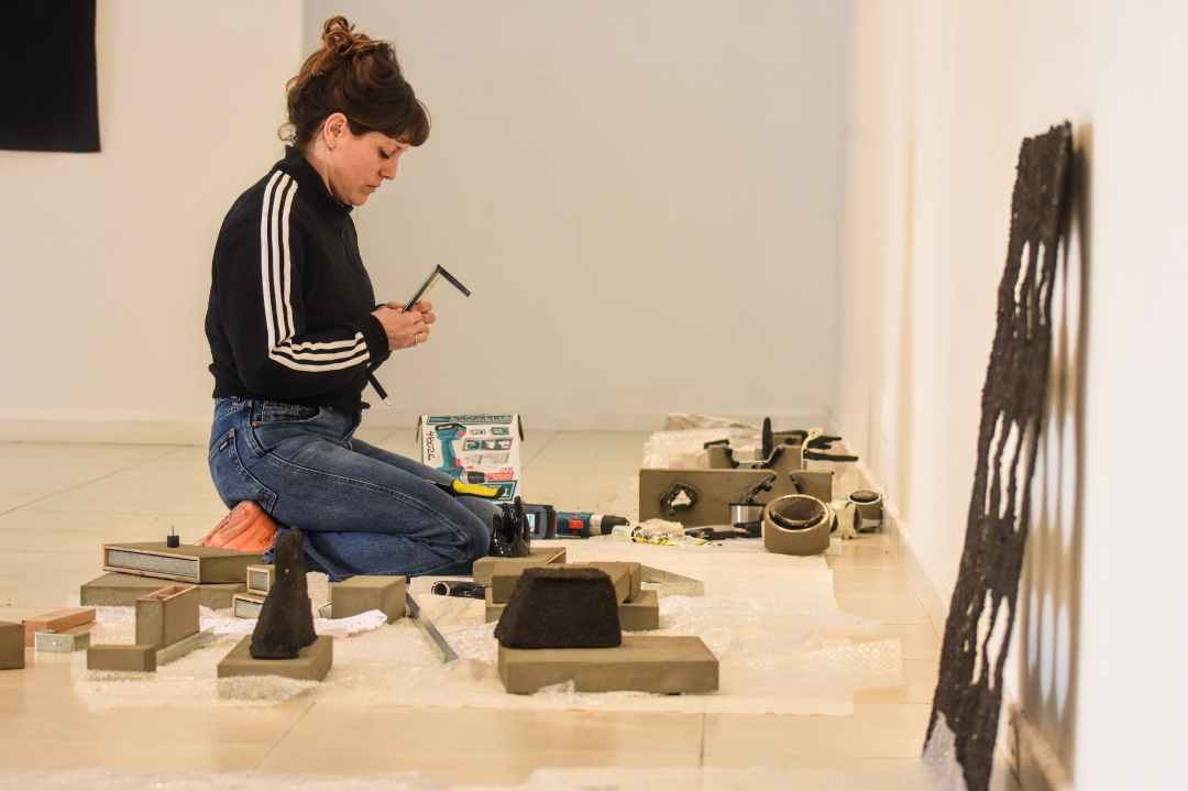 Dice Paula: “Yo trabajo piezas con arena volcánica, negra, técnicas como escultóricas, si se quiere, algunas a pared y otras como objeto, arena volcánica y resina. Y por otro lado, dibujos, algunos en gran escala y otros de más pequeña escala, dibujos a carbonilla y lápiz grafito, dibujos sobre tela. Básicamente, dibujos y esculturas. Algunos son de escala más grande, hay uno que es un tríptico, que son tres carbonillas que van ocupando una pared de 4 metros por uno y medio, eso son de escala más grande. Hay otro que son de escala más pequeña, un montaje de 30 dibujos y las obras de resina y tierra son la mayoría a pared y la escala es grande, pero por el conjunto porque las piezas son de escala mediana, Después, estamos montando otra obra en conjunto, que la materialidad es cerámica, y estamos haciendo una encofrada en tierra, a suelo, esa es una obra de sitio específico. Paula hizo la cerámica y yo estoy haciendo la encofrada en tierra para contener y como soporte de esa cerámica”.