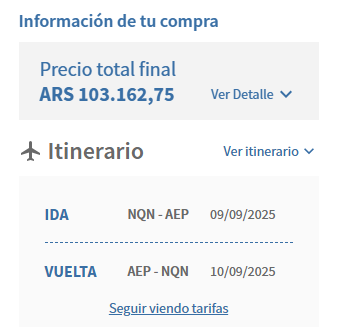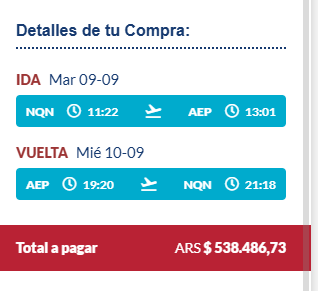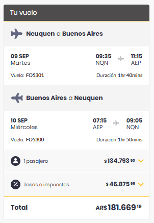 Según la web de Flybondi haciendo el mismo recorrido, con horarios diferentes, pero yendo el 9 de septiembre y volviendo el 10, el costo del pasaje es de $181.669.