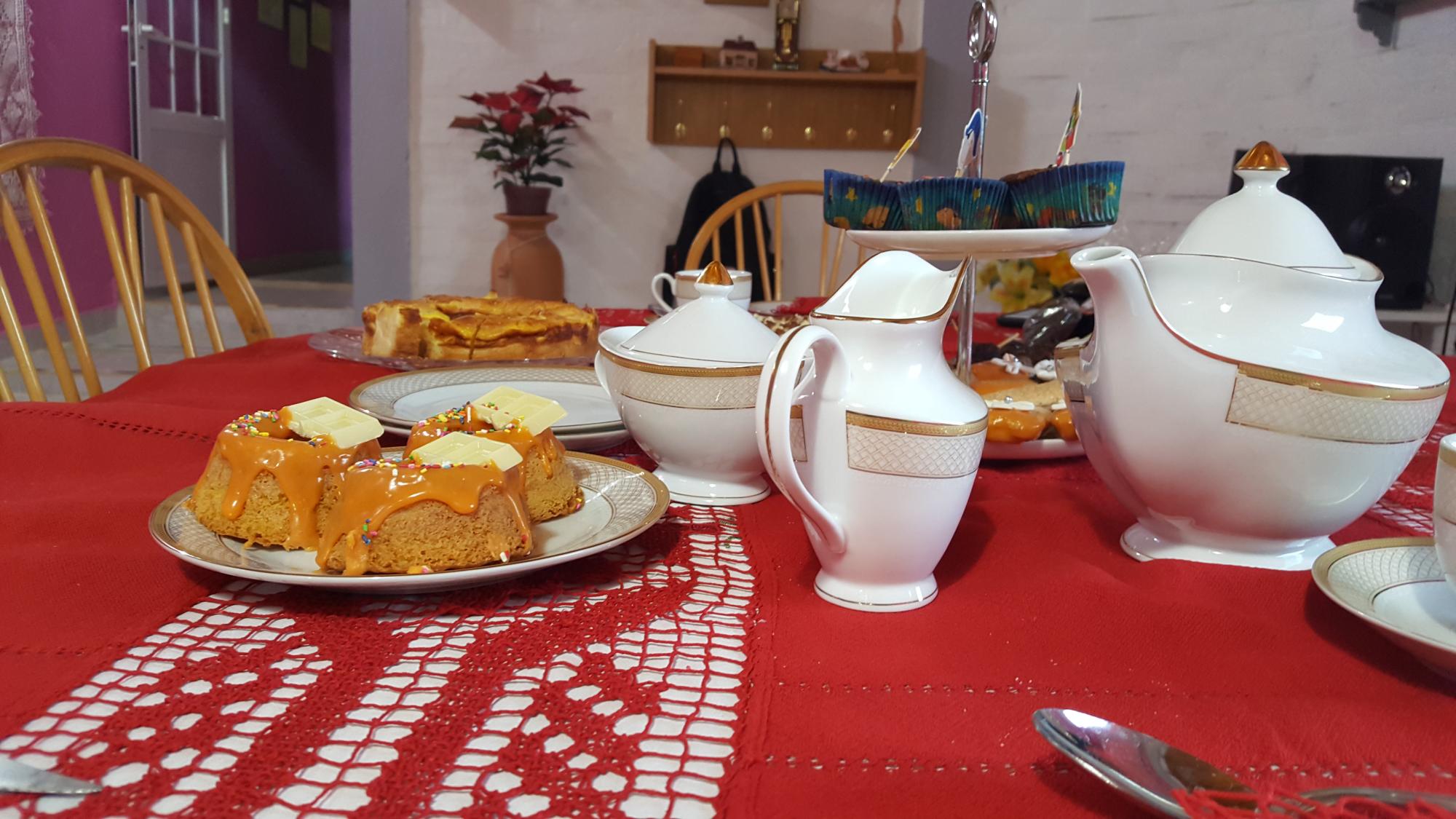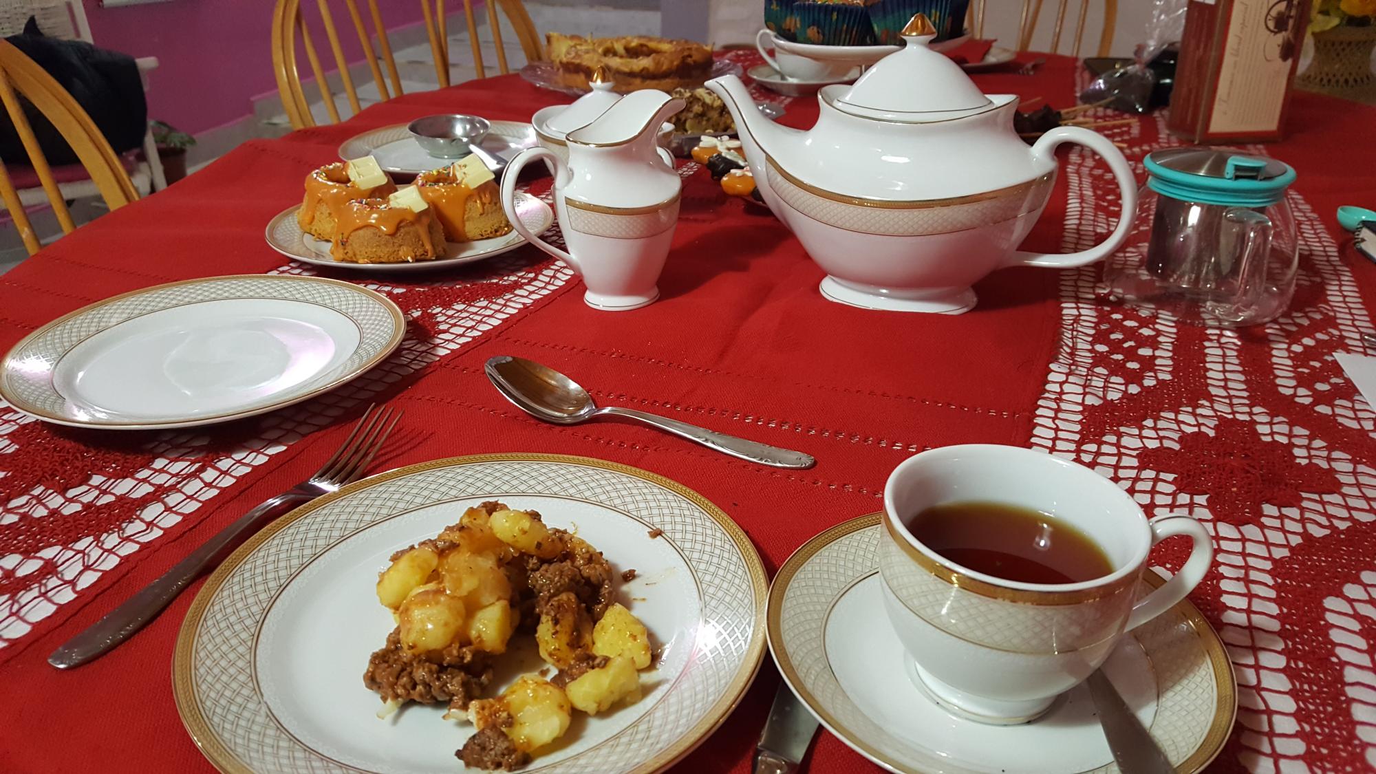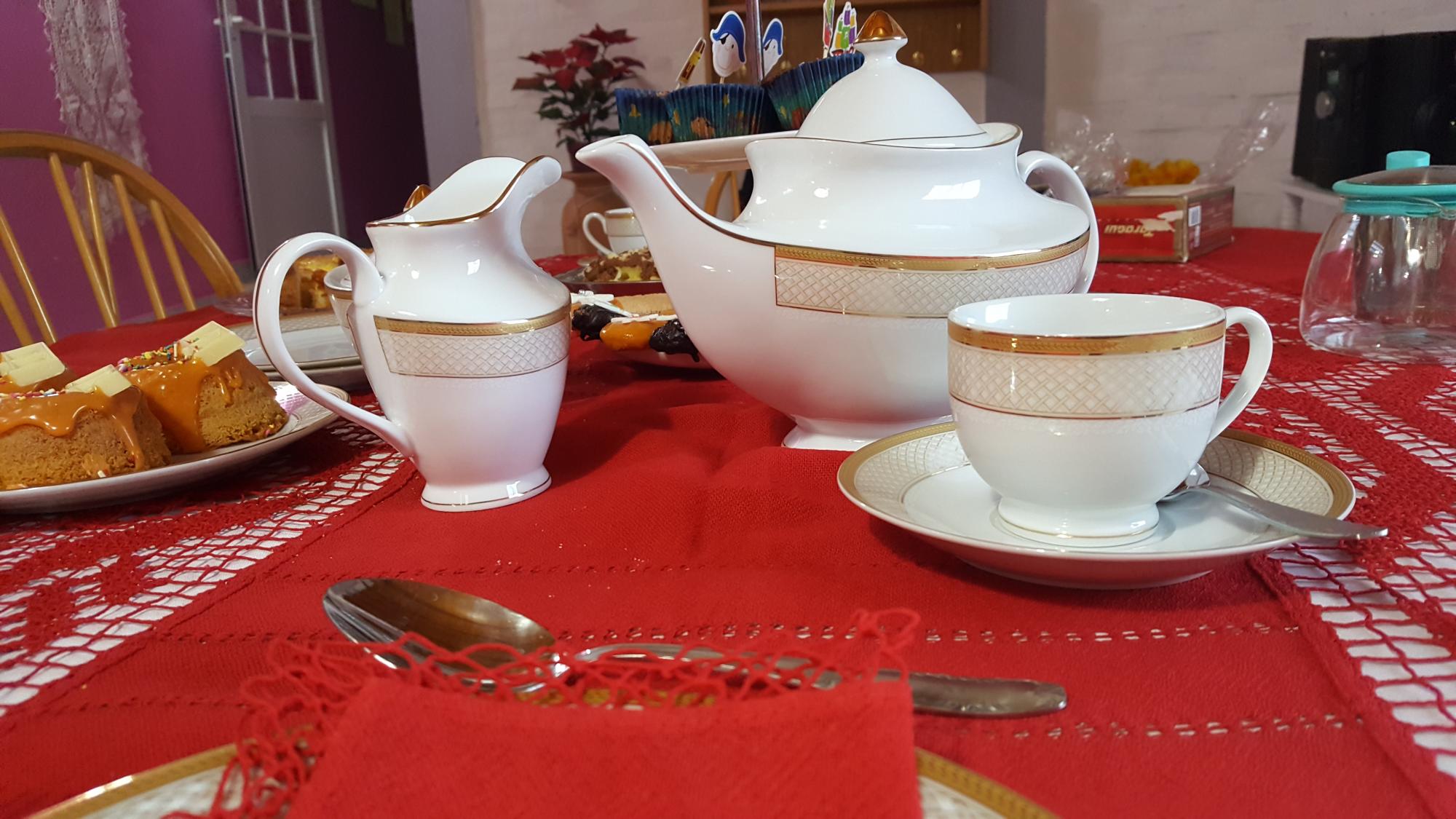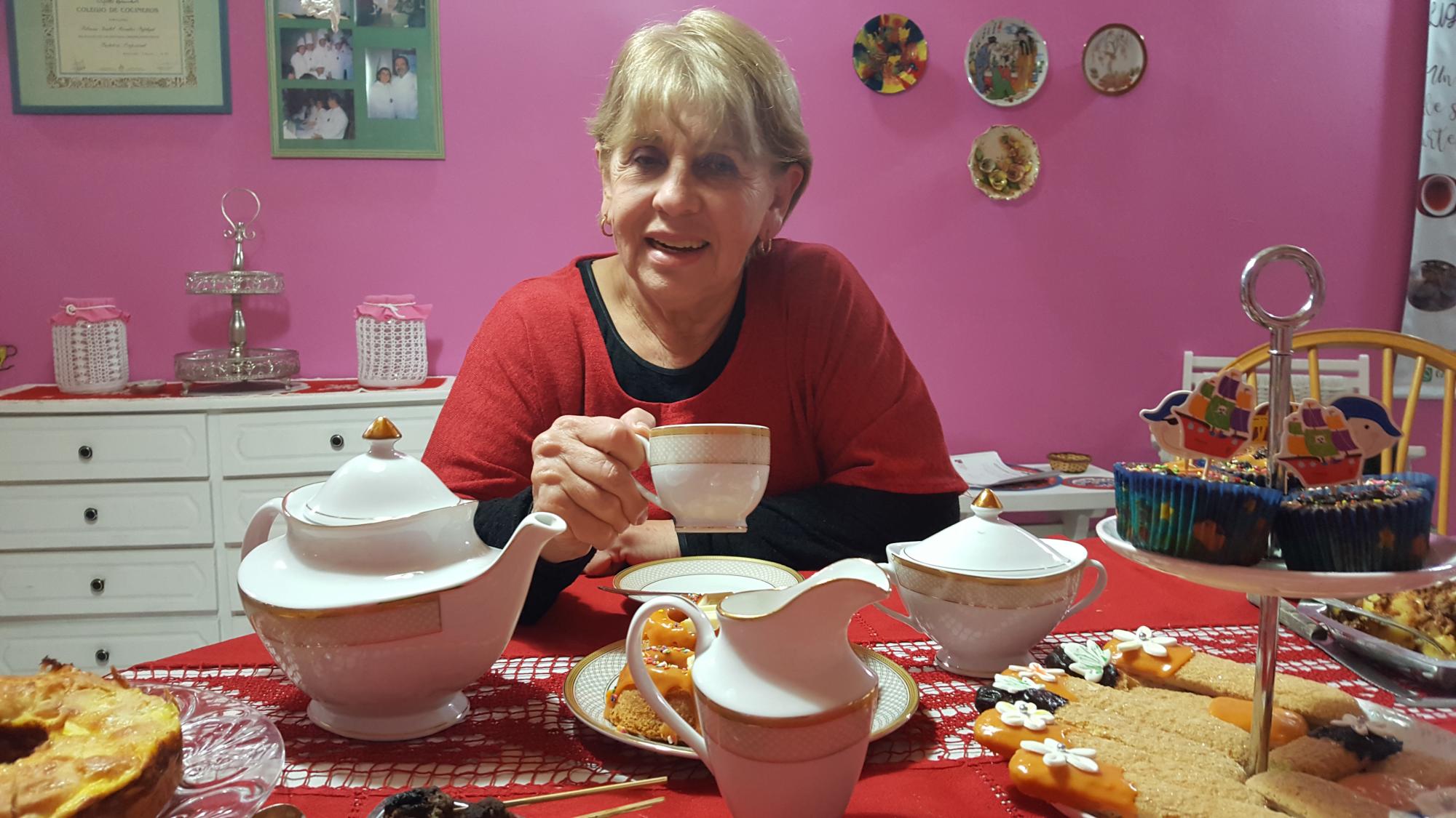 Tiene preparada en su salón -que por ahora es a puertas cerradas- una mesa sublime, donde además del té, están perfectamente acomodadas la mantelería, la vajilla y los platos salados y dulces listos para degustar. Todo fue elaborado por sus manos.