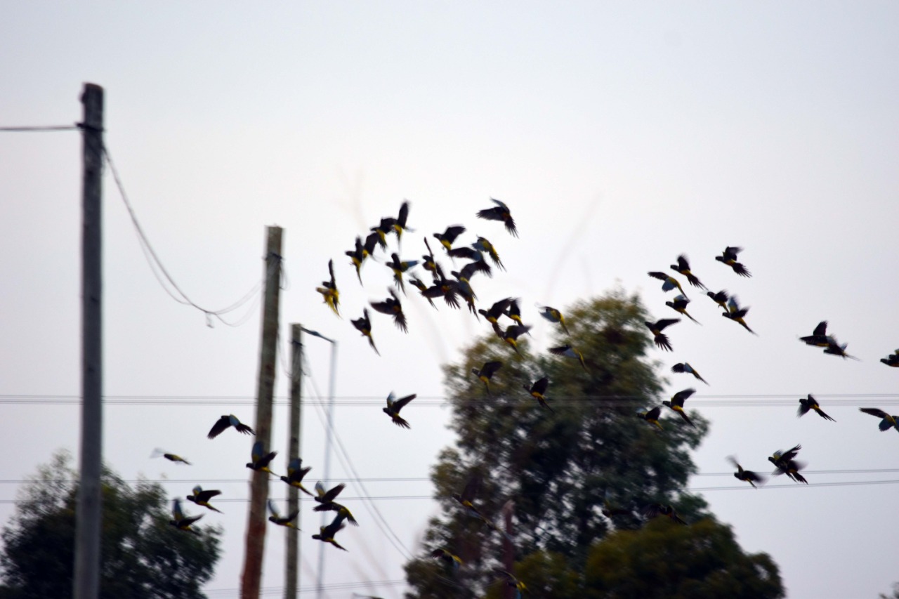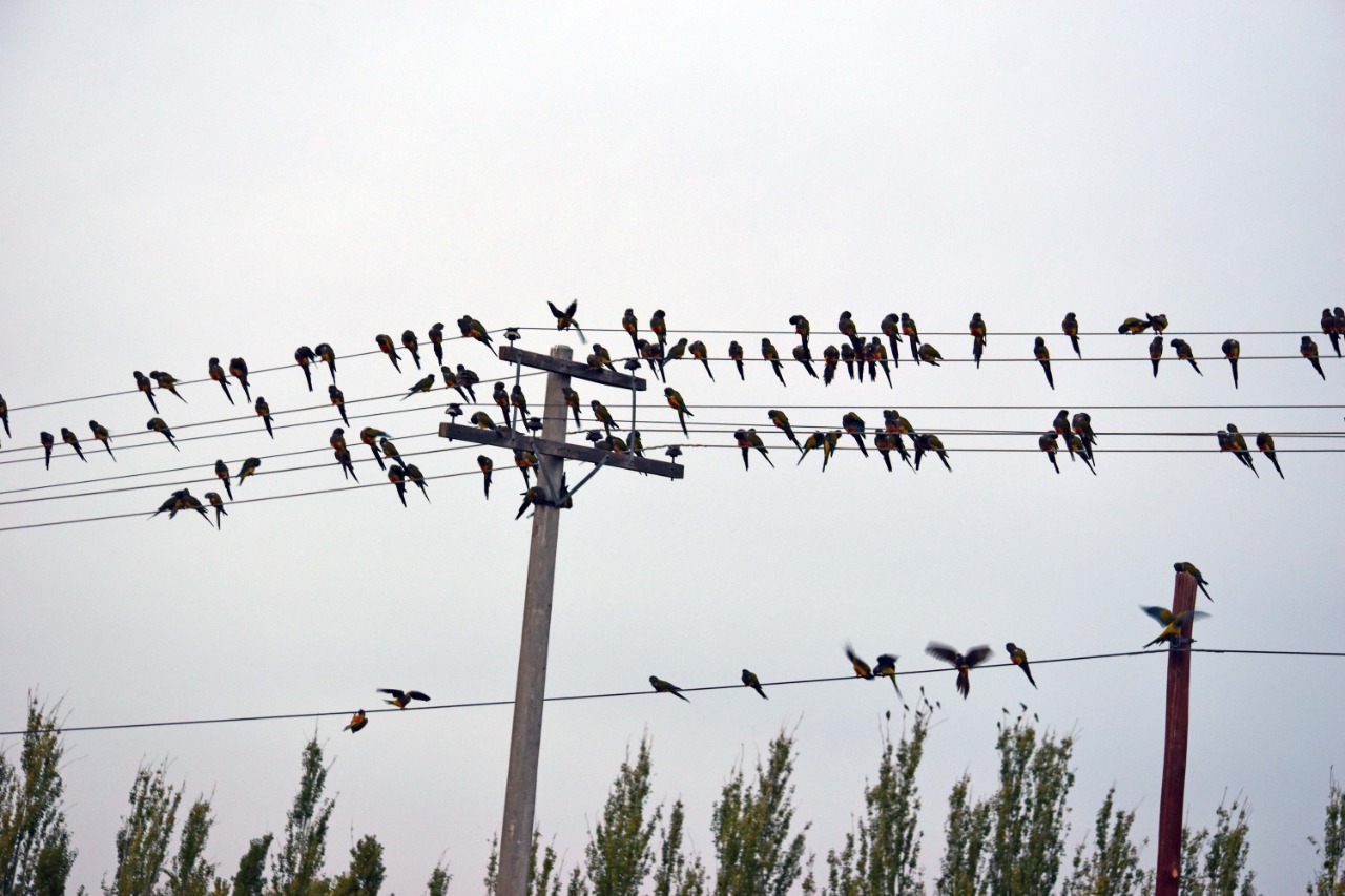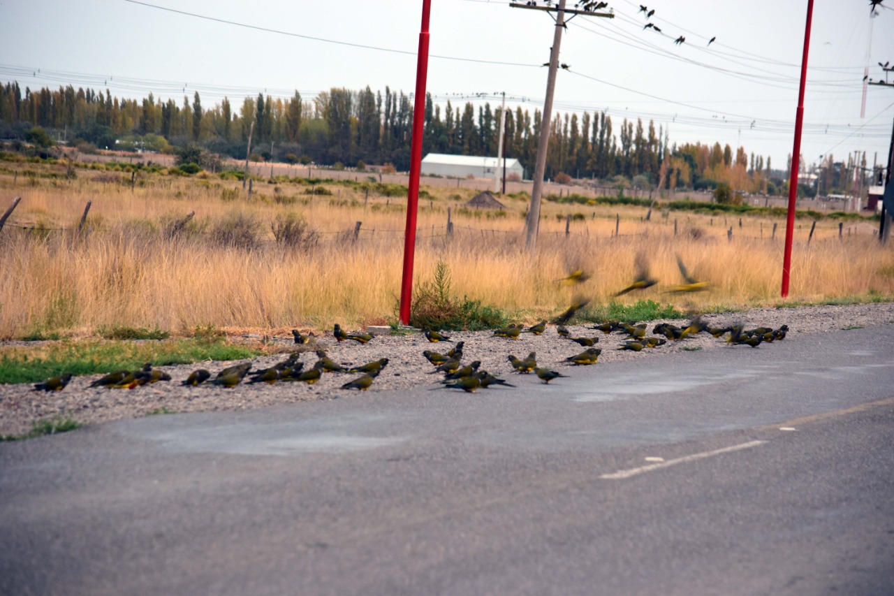 Las bandadas de loros hacen equilibrio y el ruido es ensordecedor en los cables eléctricos, que pancean al costado de las rutas.
