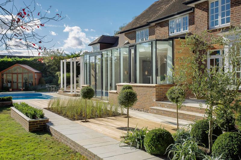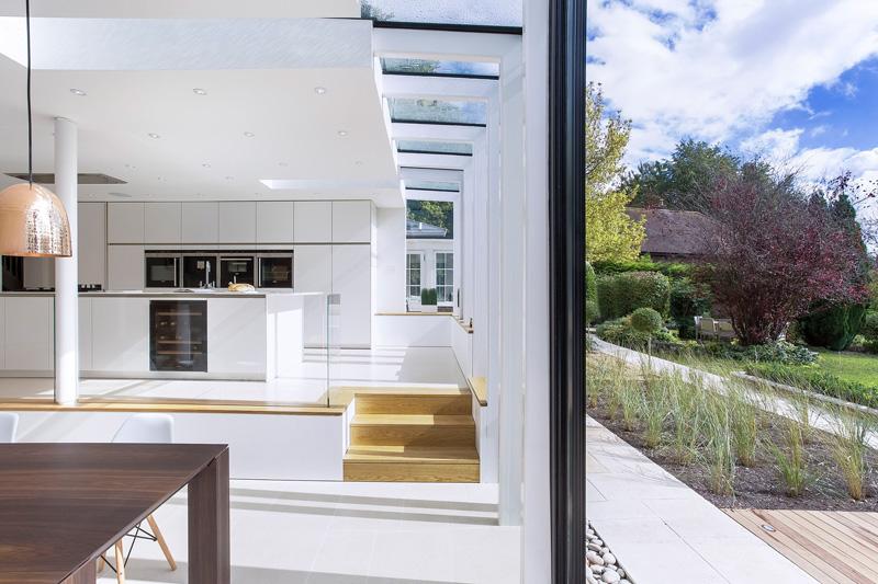 Estudio de arquitectura OB reformó esta casa de 1930 en Winchester, agregándole una cocina con grandes ventanales que dan hacia un jardín con pileta.