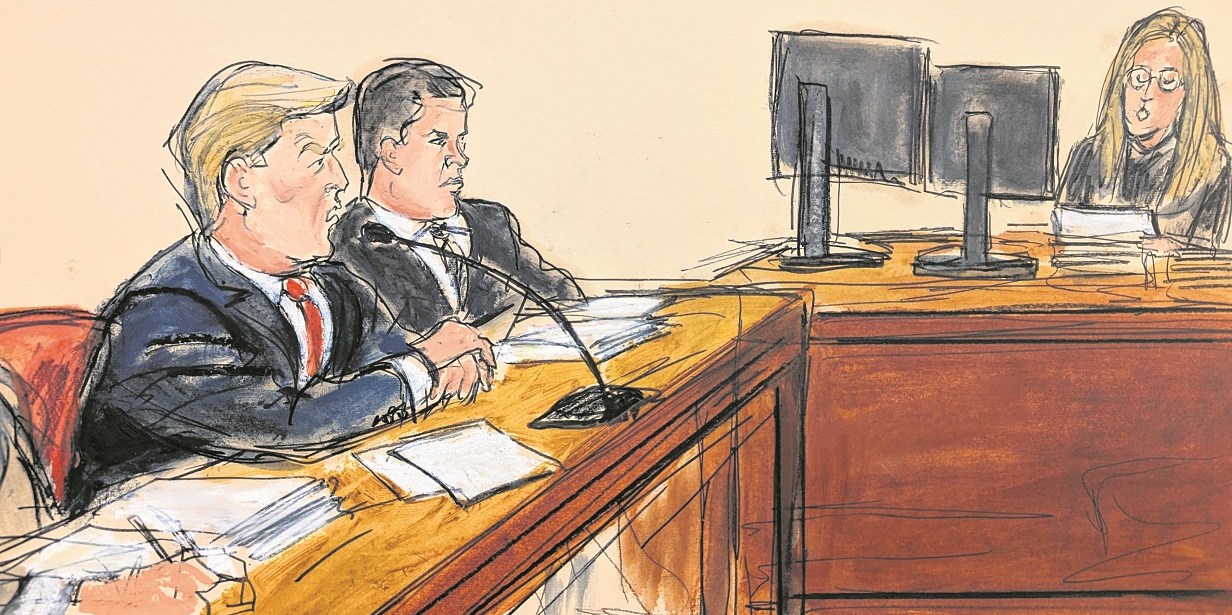 El artista del tribunal presenta la escena de cuando le fue preguntado a Trump cómo se declara ante los cargos. A su lado, Joseph Tacopina, su abogado (Elizabeth Williams via AP)