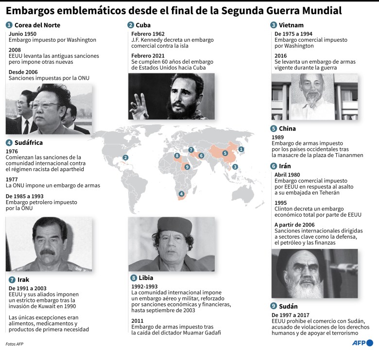 Igual que Cuba, varios países han estado sujetos a este tipo de sanciones desde la Segunda Guerra Mundial, en nombre de la lucha contra el terrorismo o de la defensa de los derechos humanos.