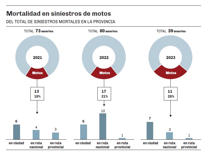 En Argentina, mueren cuatro personas cada día por accidentes en moto, según las estadísticas más recientes. La Agencia Nacional de Seguridad Vial señala que el 40% de los siniestros fatales en el país fueron protagonizados por motociclistas (la mayor proporción), ya sea en solitario o con participación de otro vehículo. Y en Río Negro representan casi una de cada tres personas fallecidas en los últimos meses en hechos de tránsito ( 28%), 11 de las 39 víctimas fatales.