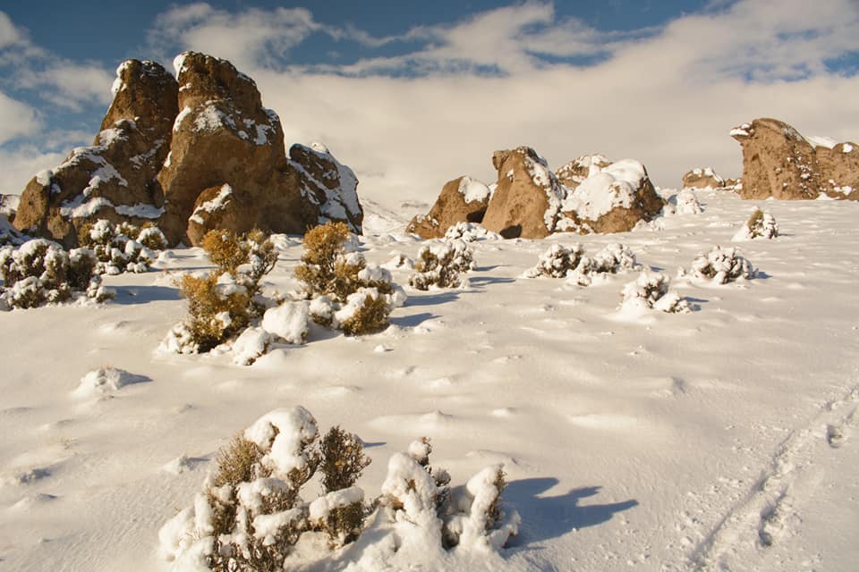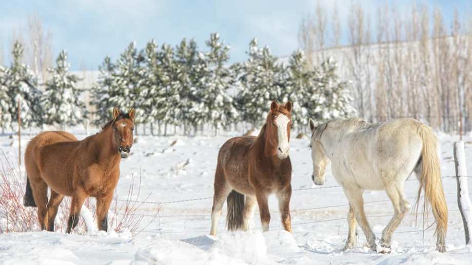 Cerca de allí, en las afueras de Manzano Amargo, jinetes y caballos le hacían frente a la nieve.