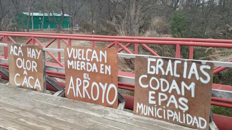El lunes, en reclamo por la situación, vecinos pegaron carteles en el puente que atraviesa el arroyo denunciando el vertido de los líquidos cloacales en el agua.
