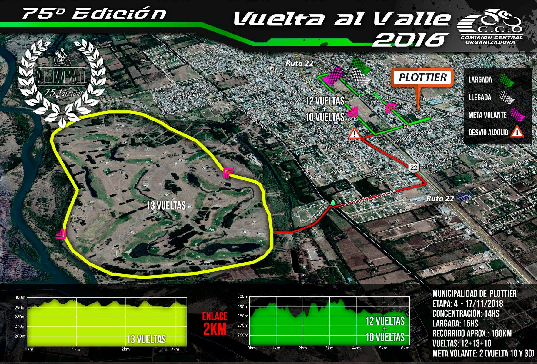 Recordaron que la cuarta etapa de la 75° edición de la Vuelta al Valle, comenzará frente al Gimnasio Municipal, en la calle Perito Moreno, continuará por la calle Zabaleta y calle Libertad hasta retomar la Av. San Martín llegando a la calle Martellota.