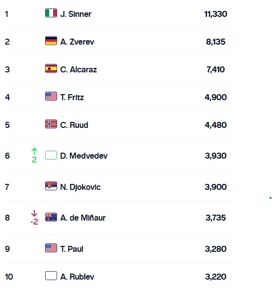 En cuanto al Top 10, el número 1 lo mantiene Jannik Sinner, que no jugará hasta el 4 de mayo próximo tras llegar a un acuerdo con la Agencia Mundial Antidopaje (AMA), que había pedido una suspensión de uno a dos años después de que el italiano dio positivo de clostebol en dos controles.