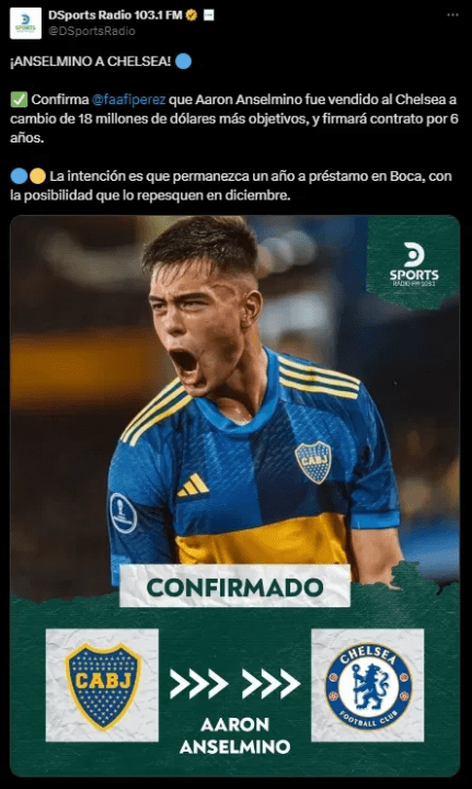 Y es que la operación se cerró en 18 millones de dólares, más objetivos, y su contrato con los Blues será por 6 años. La intención de Boca sigue siendo que se quede a préstamo un año, pero con la chance de que pueda ser repescado por el equipo londinense en el mes diciembre.