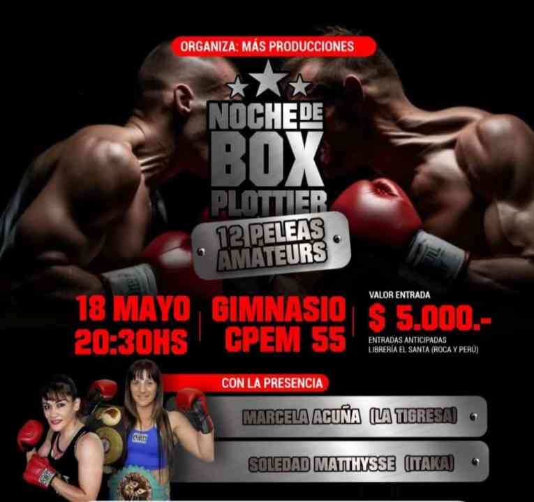 El gimnasio del CPEM 55 de Plottier tendrá una noche a puro boxeo, con la presencia de Marcela La Tigresa Acuña. La cita será el sábado 18 de mayo, a partir de las 20:30, y se anuncia un extenso programa de combates entre amateurs. Habrá un título Provincial en juego y la fiscalización será de la Federación Neuquina de Boxeo.