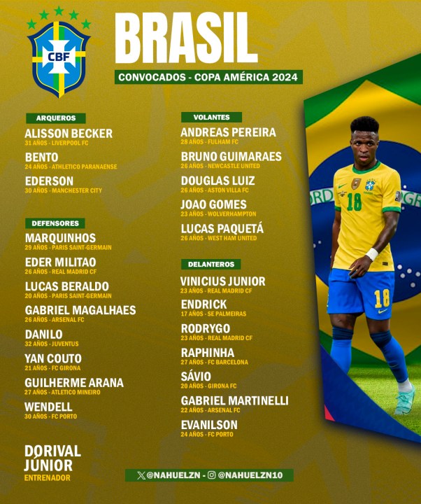 Con la ausencia de Neymar, quien no llegó a recuperarse una grave lesión, el entrenador Dorival Júnior presentó la lista definitiva de la selección de Brasil para la Copa América de Estados Unidos 2024.