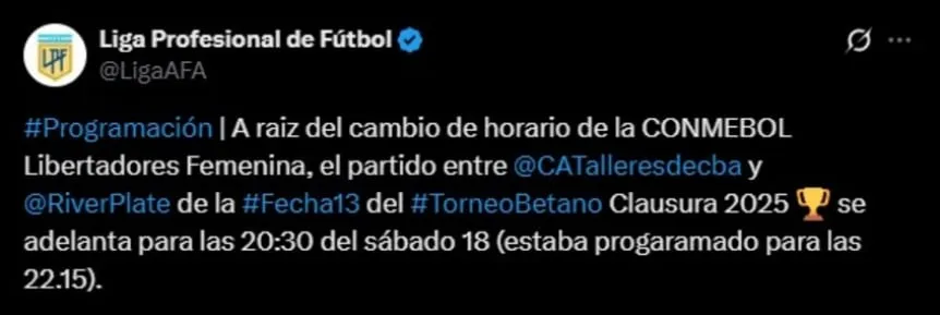 La Asociación del Fútbol Argentino comunicó que el partido entre Talleres y River, por fecha 13 del torneo Clausura, cambió de horario y se jugará el próximo sábado a las 20.30, cuando originalmente estaba pautado para las 22.15.