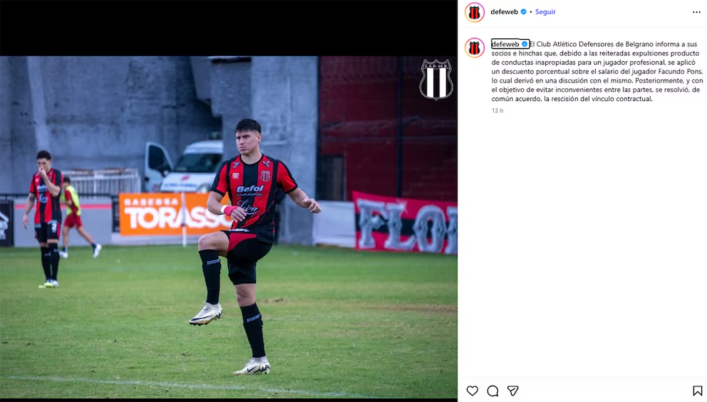 “El Club Atlético Defensores de Belgrano informa que, debido a las reiteradas expulsiones por conductas inapropiadas para un jugador profesional, se aplicó un descuento porcentual sobre el salario de Facundo Pons, lo que derivó en una discusión con el jugador. Posteriormente, y con el objetivo de evitar inconvenientes entre las partes, se resolvió de común acuerdo la rescisión del vínculo contractual”, explicó el club.