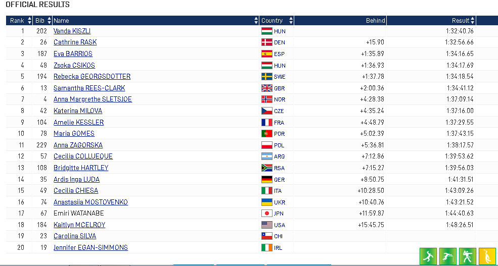 La ganadora, al igual que el lunes en la corta, fue la húngara Vanda Kiszli, con un registro de 1:32:40.76. Segunda finalizó la danesa Cathrine Rask y tercera la española Eva Barrios, que había sido plata en la short.