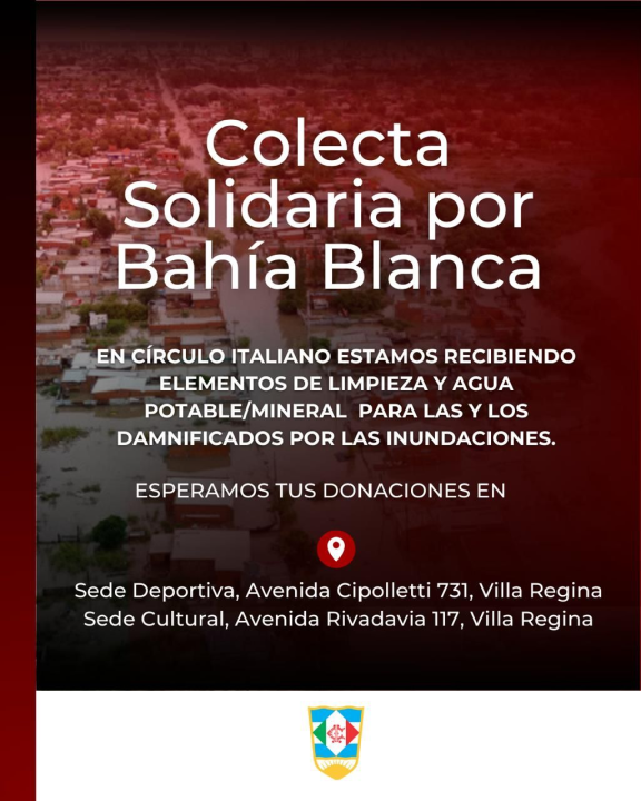 Mientras que Círculo Italiano de Villa Regina también informó que en las instalaciones del club se estará recibiendo elementos de limpieza y agua potable para los damnificados. Los elementos se deberán llevar a las dos sedes: Deportiva, ubicada en Avenida Cipolletti 731, y Cultural, en Avenida Rivadavia 117.