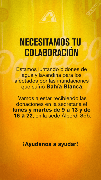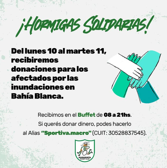A su vez, en la misma localidad, el Club Marabunta dio a conocer que «durante esta semana, entre el lunes 10 y el martes 11, estaremos recibiendo donaciones para los afectados por las inundaciones en Bahía Blanca, y necesitamos tu colaboración».
