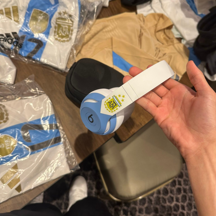 Los presentes, auriculares Beats Studio Pro de la renombrada marca Beats by Dre, incluyen también el escudo de la Selección Argentina en uno de sus laterales, añadiendo un toque distintivo.