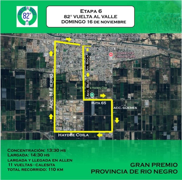 La etapa en la que se conocerá al campeón de la histórica Vuelta al Valle contará con 11 vueltas y 110 kilómetros en un circuito tipo “calesita” en Allen. La largada será a las 14:30 y la concentración una hora antes.