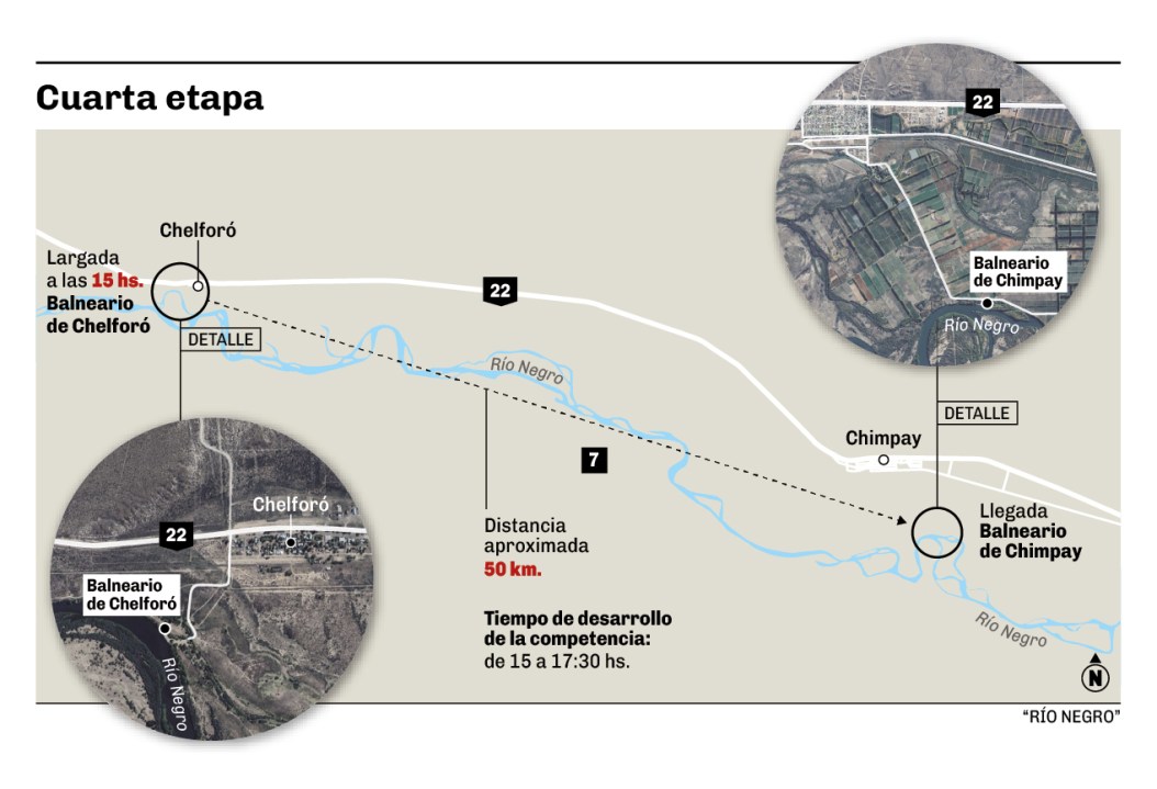 La Regata Internacional del Río Negro retoma la acción este lunes con la cuarta etapa después de la pausa dominical. Será entre Chelforó y Chimpay, a partir de las 15 horas.