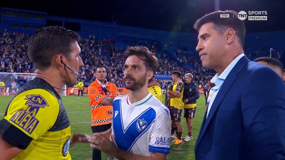 Apenas el árbitro indicó el final del encuentro en Liniers, Sebastián Domínguez, DT de Vélez fue a pedirle explicaciones al juez principal y le recriminó varias jugadas que, según su mirada beneficiaron al Calamar. Sobre todo la falta de Juan Ignacio Saborido que no fue sancionada con doble amonestación.