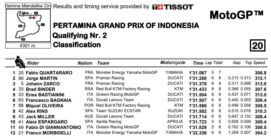 De a poco el campeón Fabio Quartararo se va reencontrando con su mejor versión a bordo de la Yamaha del equipo oficial y en la madrugada argentina el Diablo se quedó con el primer lugar en la clasificación de la segunda fecha, que se está realizando en el circuito de Indonesia en su historia visita, seguido por los dos pilotos del Pramac Racing de Ducati.