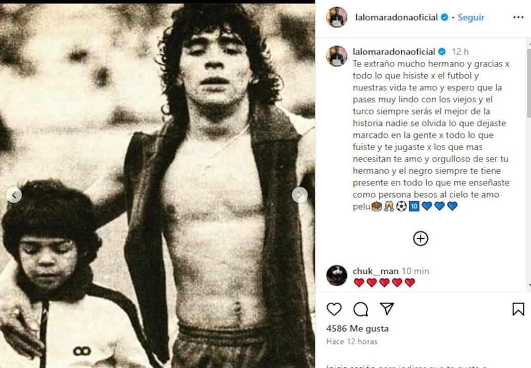 “Te extraño mucho, hermano, y gracias por todo lo que hiciste por el fútbol y por nuestra vida. Te amo y espero que la pases muy lindo con los viejos y el Turco”, comenzó Lalo Maradona en un emotivo mensaje que subió a su cuenta de Instagram (@lalomaradonaoficial) junto a varias fotos que retratan momentos felices de ambos.