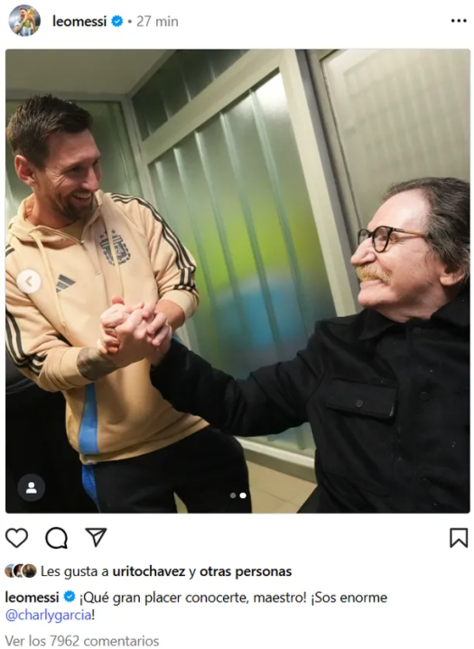 Tras el cara a cara, Messi no dudó en replicar en sus redes sociales lo que se dijo con el reconocido cantautor: «¡Qué gran placer conocerte, maestro! ¡Sos enorme, Charly García!», escribió el astro del fútbol, mostrando profunda admiración por quien ya se ha convertido en una leyenda de la música nacional.