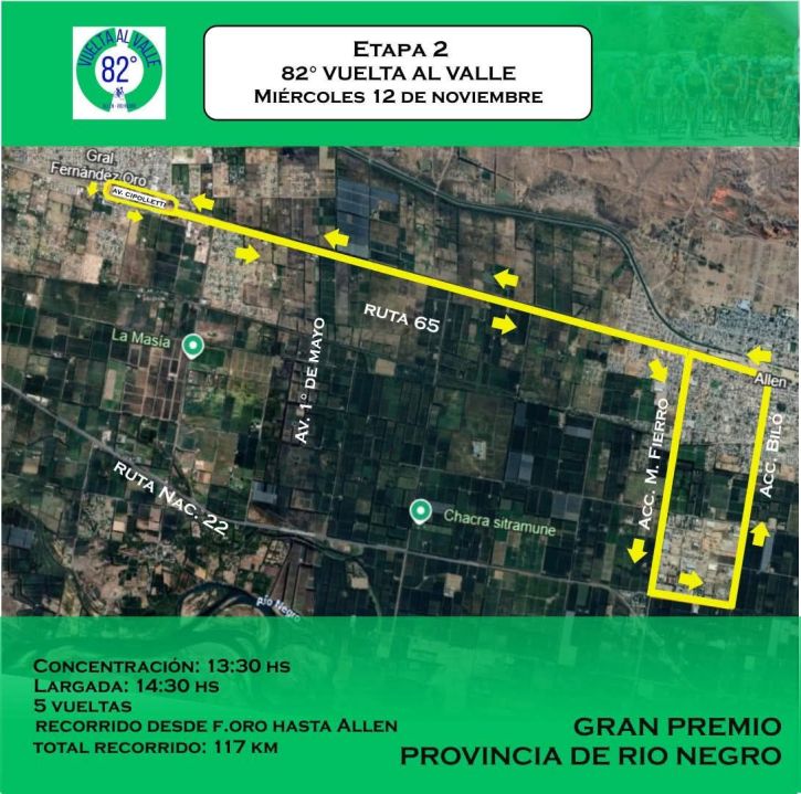 Este miércoles será la segunda etapa con largada y llegada en Fernández Oro. Empieza 14:30 y va hasta Allen por Ruta 65. Serán 5 vueltas en un recorrido total de 117 km.