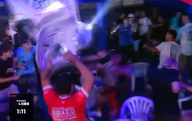 Según se vio en la transmisión realizada por TyC Sports, durante el cuarto round, el árbitro decidió parar el choque al observar incidentes en las inmediaciones del ring.