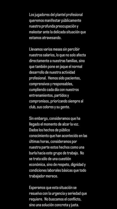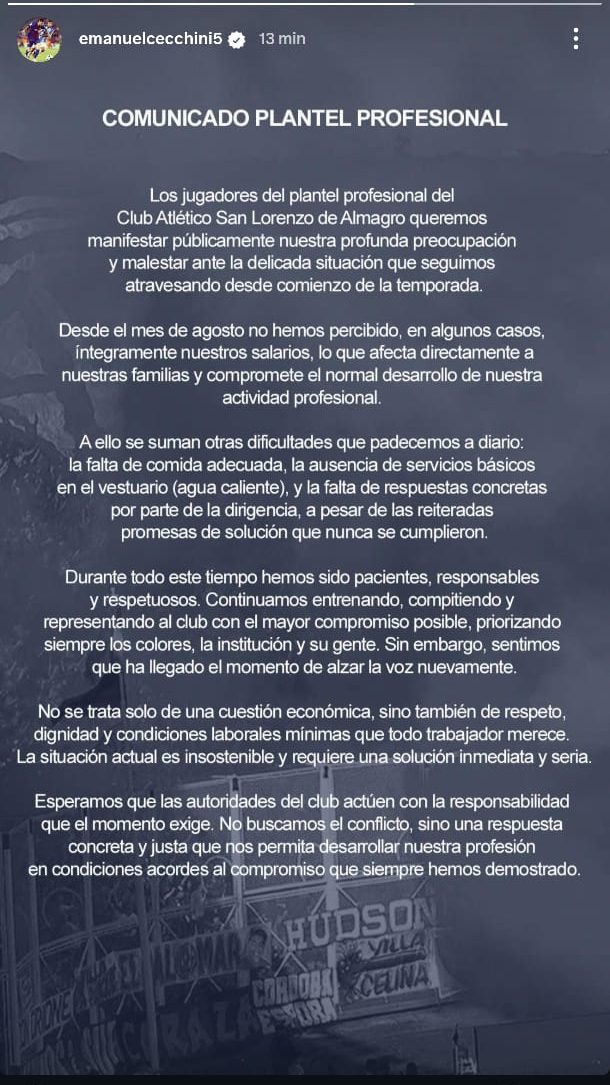 El mensaje fue replicado por la mayoría de los integrantes del plantel, entre ellos el hurguense Emanuel Cecchini, quien compartió el comunicado en sus historias de Instagram.