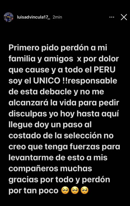 El lateral le pidió «perdón» a su «familia y amigos por el dolor que cause y a todo el Perú». Además, se señaló como «el único responsable de esta debacle».