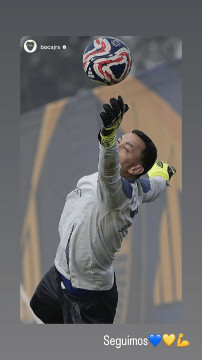 El arquero reposteó una foto que subió la cuenta oficial de Boca, en la que se lo ve volando durante la práctica junto con el mensaje: «Seguimos«.