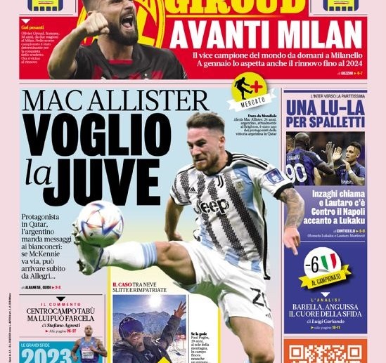 La noticia que causó impacto este miércoles en Italia la dio su más importante diario deportivo, La Gazzetta dello Sport, que puso en su portada la foto de Mac Allister con la camiseta de la selección argentina junto a la del francés Adrien Rabiot y el director técnico Massimiliano Allegri, mencionando que éste pidió por el actual mediocampista del Brighton & Hove inglés.