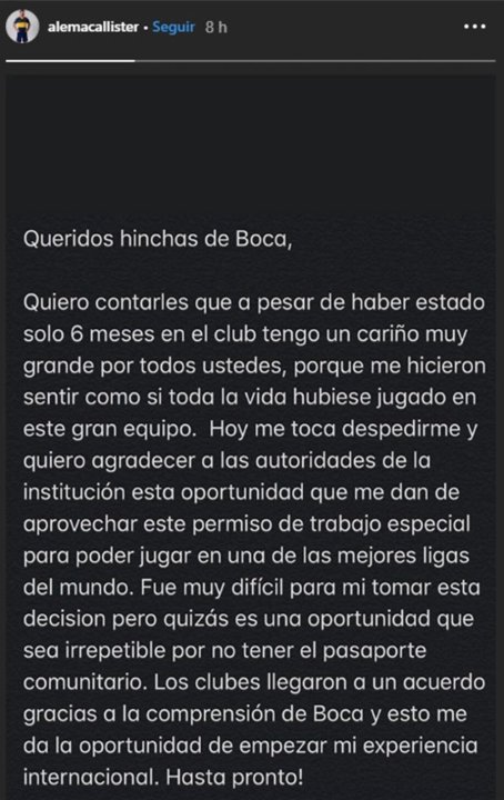 Las críticas de Mac Allister de aquel momento y de ahora difieren del comunicado que publicó cuando se fue. En esa ocasión, dijo que «fue muy difícil tomar está decisión» y que «quizás es una oportunidad irrepetible». Además valoró la actitud de Boca para resolver los trámites y facilitar su partida al Brighton. La pregunta es si en esa oportunidad fue políticamente correcto y evitó los problemas o si ahora exagera su versión.
