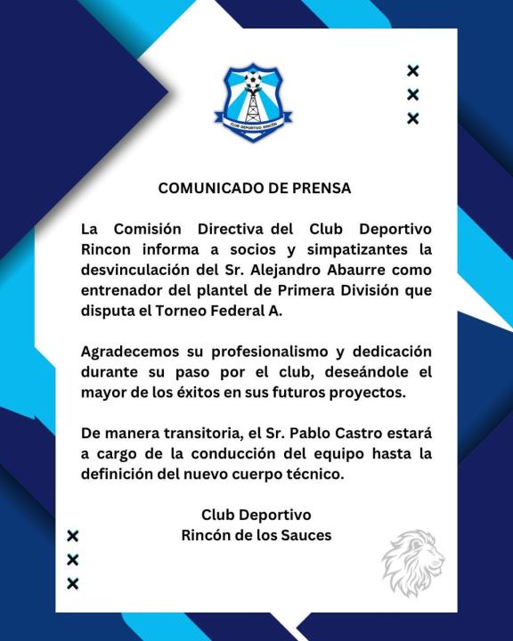 En una decisión sorpresiva, Deportivo Rincón anunció la salida de Alejandro Abaurre que no seguirá como entrenador en el Federal A.