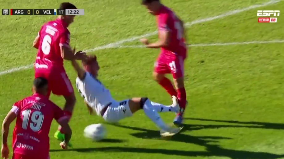 El delantero de Vélez vio la roja directa por un planchazo en la semifinal de la Copa de la Liga. Facundo Tello revisó la jugada en el VAR y no dudó.