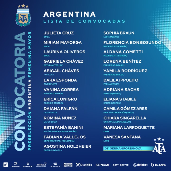 La lista de las 26 jugadoras preseleccionadas por Germán Portanova, director técnico del seleccionado argentino.