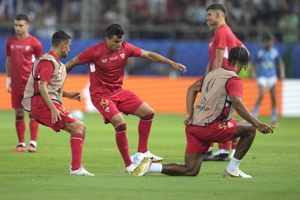 En el primer tiempo Sevilla se impone por 1-0 al City en Grecia con un tanto del marroquí Youssef En-Nesyri, a los 25 minutos del primer tiempo, tras un gran centro del Huevo Acuña desde la izquierda.
