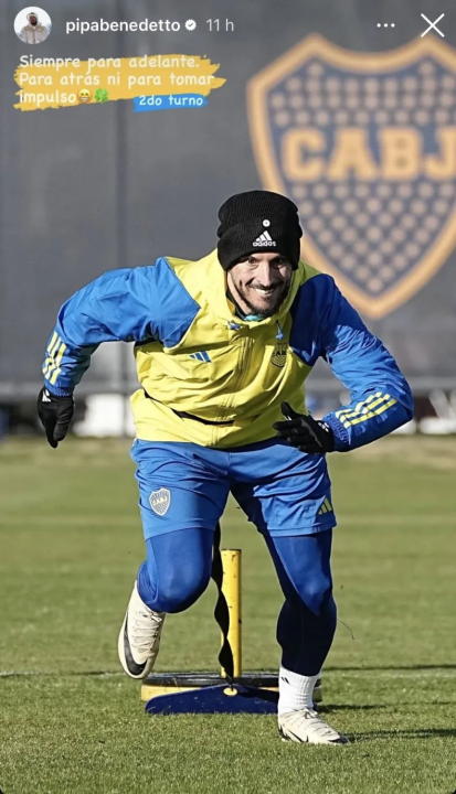 «Siempre para adelante. Para atrás, ni para tomar impulso», fueron las palabras del Pipa junto a una foto suya durante uno de los entrenamientos de pretemporada que viene realizando el plantel, más precisamente en un «segundo turno», como indicó en la historia el goleador.