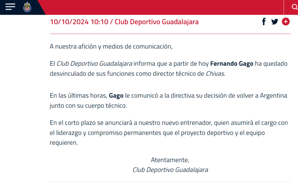 Esta mañana, el elenco mexicano difundió un breve mensaje en el que critica de manera contundente la decisión de Pintita. «El Club Deportivo Guadalajara informa que a partir de hoy Fernando Gago ha quedado desvinculado de sus funciones como director técnico», escribieron. Y remarcaron que «en las últimas horas Gago le comunicó a la directiva su decisión de volver a Argentina».