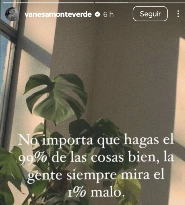 Si bien en la historia no incluyó fotos de su pareja con la camiseta de River o el momento de la jugada, la fase que escribió fue bastante elocuente. «No importa que hagas el 99% de las cosas bien, la gente siempre mira el 1% malo», disparó.