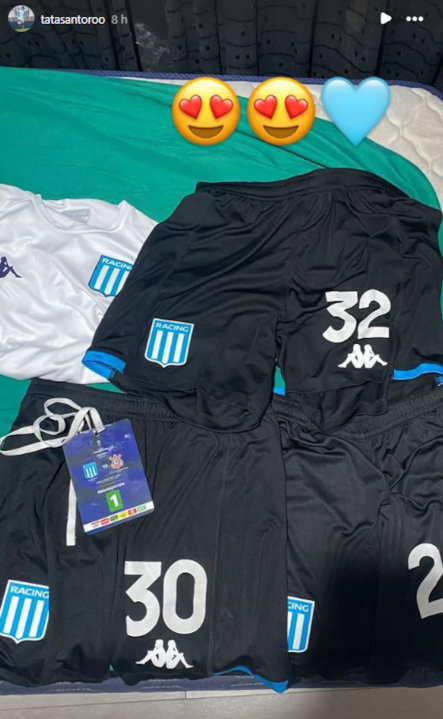 En su cuenta de Instagram, Santoro publicó que se llevó de regalo una remera y los pantalones de Sigali, de Almendra y Agustín García Basso. Además, en la imagen colocó la credencial que utilizó en el partido.
