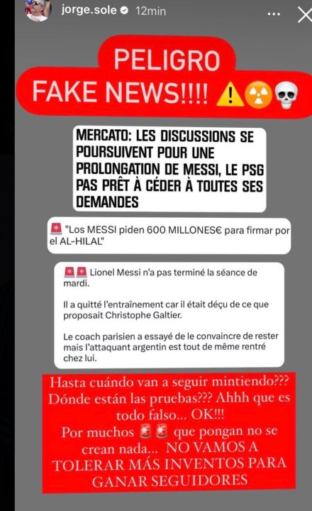 Con un posteo en su cuenta de Instagram, Jorge Messi mostró su cansancio por las ‘fake news’ que circularon en las últimas horas. «¿Hasta cuándo van a seguir mintiendo? ¿Dónde están las pruebas? Ahh que es todo falso, ok. No vamos a tolerar más inventos para ganar seguidores», escribió el padre del campeón del mundo.