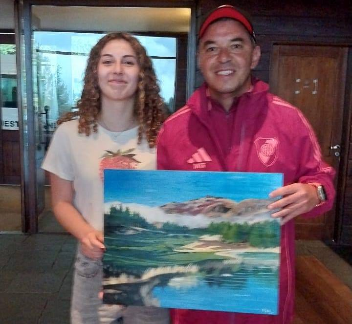 Eva, una joven zapalina que estudia el profesorado de Dibujo, vivió un momento inolvidable en la concentración de River. Junto a su familia, le entregó personalmente una obra de arte al entrenador de la Banda.