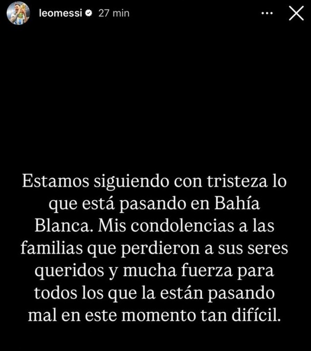 “Estamos siguiendo con tristeza lo que está pasando en Bahía Blanca. Mis condolencias a las familias que perdieron a sus seres queridos y mucha fuerza para todos los que la están pasando mal en este momento tan difícil”, escribió el capitán de la Selección Argentina.