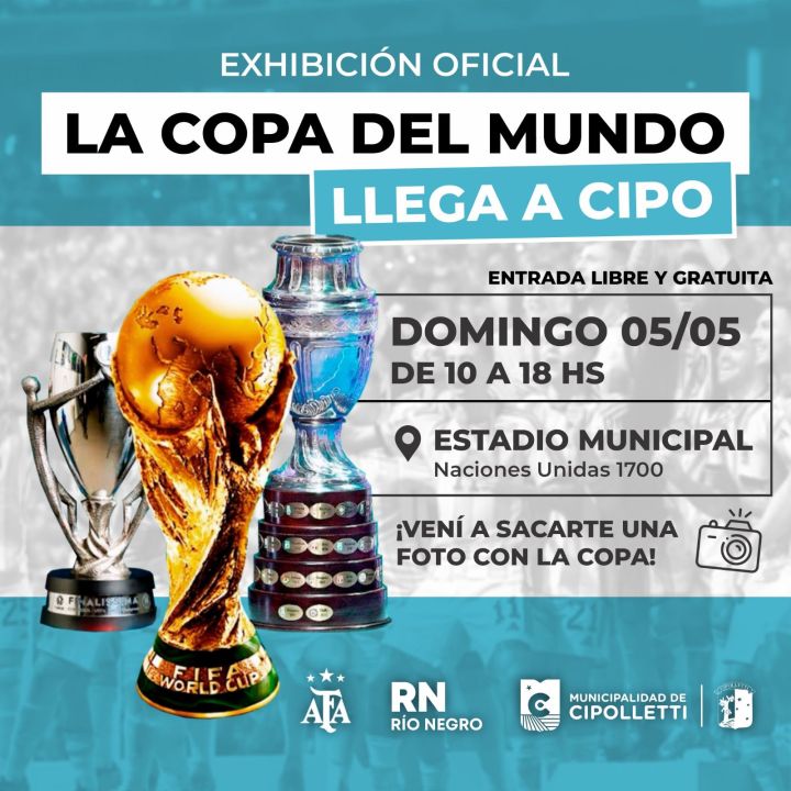 También se mostrarán la Copa América y el trofeo de la Finalissima. Ayer estuvo en Roca, y este sábado, en el DUAM de Neuquén. El domingo, en el Estadio Municipal de Cipolletti. Estos son los horarios.