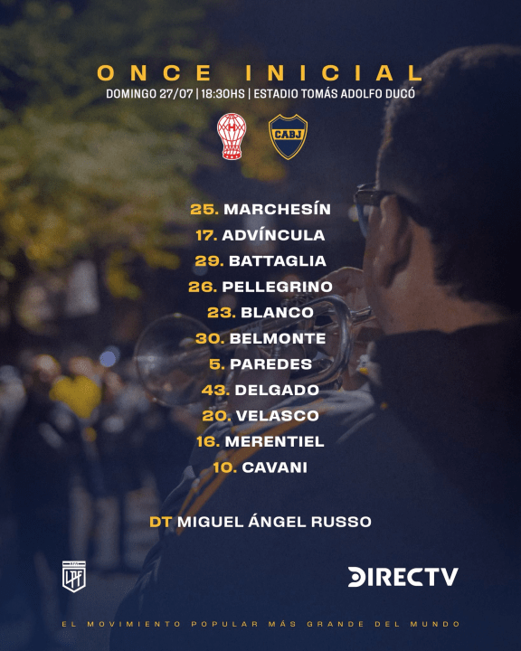 Agustín Marchesín; Luis Advincula, Rodrigo Battaglia, Marco Pellegrino, Lautaro Blanco; Leandro Paredes, Milton Delgado; Tomás Belmonte; Alan Velasco; Miguel Merentiel y Edinson Cavani. DT: Miguel Ángel Russo.