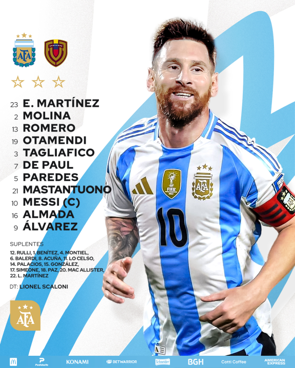 Emiliano Martínez; Nahuel Molina, Cristian Romero, Nicolás Otamendi, Nicolás Tagliafico; Rodrigo De Paul, Leandro Paredes, Franco Mastantuono, Lionel Messi, Julián Álvarez, Thiago Almada. DT: Lionel Scaloni. Franco Mastantuono; Lionel Messi, Julián Álvarez, Thiago Almada. DT: Lionel Scaloni.