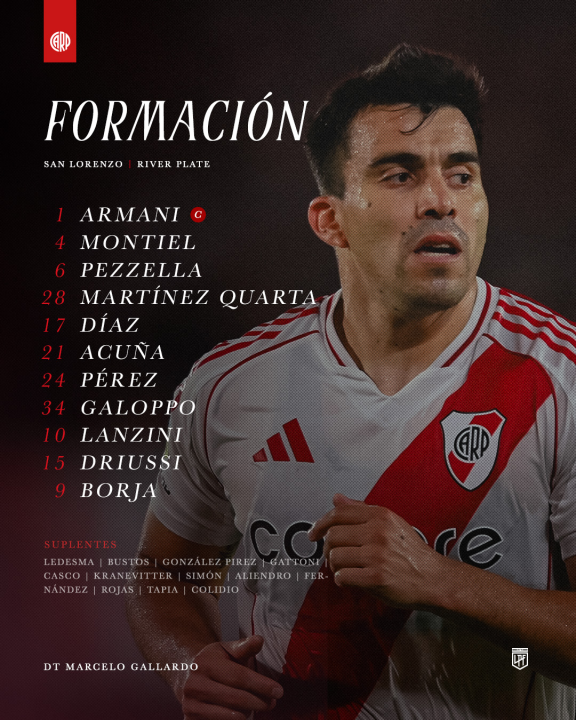 Franco Armani; Gonzalo Montiel, Germán Pezzella, Lucas Martínez Quarta, Paulo Díaz, Marcos Acuña; Enzo Pérez, Giuliano Galoppo, Manuel Lanzini; Sebastián Driussi y Miguel Ángel Borja.